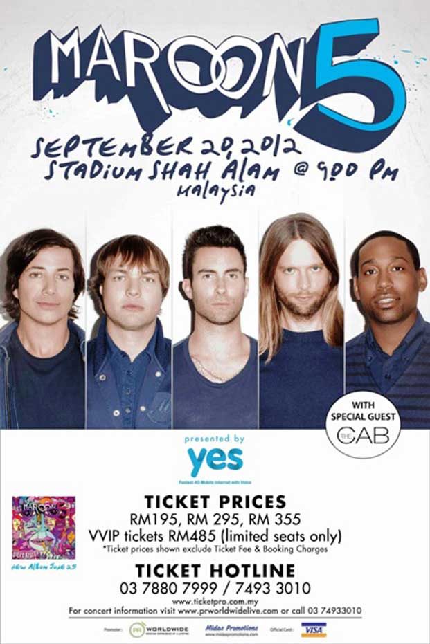 Maroon 5 akan kembali menghibur penggemar Jakarta mereka dengan sebuah konser pada 5 Oktober 2012 di Istora Senayan, Jakarta. Ini akan menjadi penampilan kedua mereka di tanah air setelah tampil pada konser sold out 27 April 2011 lalu. Grup musik beraliran pop rock yang berasal dari Los Angeles, California Amerika Serikat. Rencananya menggelar konsernya pada 5 Oktober 2012, di Istora Senayan, Jakarta. Java Musikindo selaku promotor telah mengumumkan pembagian kelas serta harga tiket konser. Band yang digawangi oleh Adam Levine (vokal/gitar), Jesse Carmichael (keyboard/gitar),Mickey Madden (bass), James Valentine (gitar), Matt Flynn (drum) ini menggelar konser di Jakarta sebagai bagian dari promo album barunya, Overexposed, yang dirilis Juni lalu. (Roy)