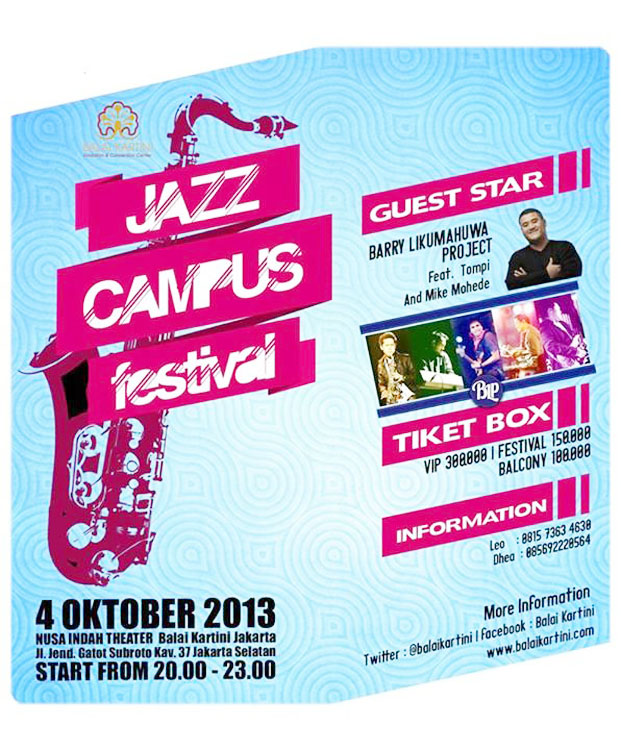 Gaung Musik Jazz Di Tanah Air Semakin Bergema, Hal Ini Terbukti Dengan Seringnya Digelar Berbagai Konser Musik Jazz Di Indonesia Khususnya Di Jakarta. Salah Satu�event Musik Jazz�yang Akan Digelar Di Jakarta Adalah�Jazz Campus Festival�yang Akan Digelar Di Nusa Indah Theater, Balai Kartini Jakarta, Pada 4 Oktober 2013 Mendatang, Pukul 20.00 - 23.00 Wib. Jazz Campus Festival�akan Menampilkan Musisi Papan Atas Seperti Barry Likumahuwa Project Feat. Tompi Dan Mike Mohede. Tiket Konser Yang Dipromotori Oleh Balai Kartini Ini Terbagi Menjadi 3 Kelas, Sebagai Berikut: