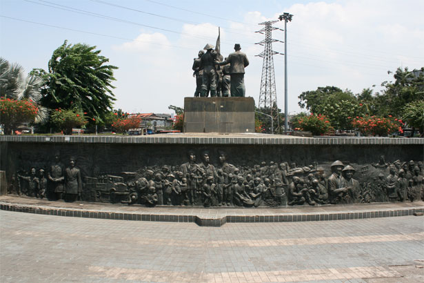Di tambah bau pesing yang menyengat hidung dan banyak sampah hasil kegiatan nongkrong dari orang-orang yang sekedar menghabiskan waktu di tempat ini. Sebenarnya tempat ini fasilitas bangunannya masih cukup layak hanya perlu sentuhan perawatan karena areanya cukup luas. Di monumen ini terlihat patung beberapa orang pahlawan perang yang saling membantu satu sama lainnya, karena itulah monumen ini dinamakan Kesetiakawanan Sosial Nasional. Dan tepat di bagian belakang patung tersebut terdapat ukiran batu panjang membentuk setengah bulatan yang seakan bercerita tentang kisah perjuangan nasional, keberagaman bangsa kita, kayanya Indonesia yang terangkum dalam satu pahatan batu yang terlihat masih cukup baik kondisinya.