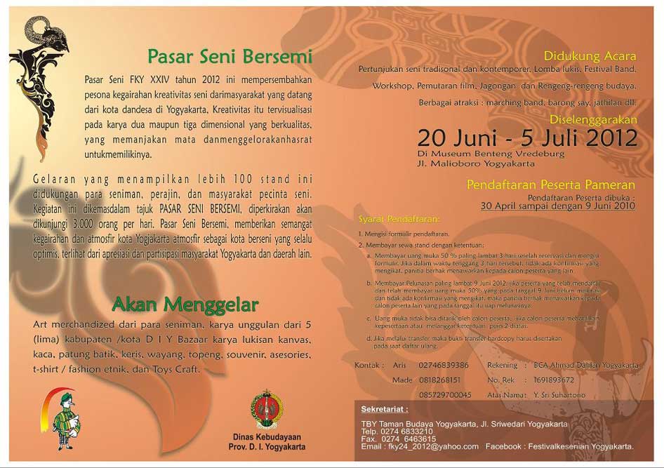 Festival Kesenian Yogyakarta 2012 Pasar Seni Festival Kesenian Yogyakarta yang ke-24 (FKY 2012), mengambil tagline 'PASAR SENI BERSEMI', sebagai respon terhadap berkembangnya apresiasi masyarakat D.I.Yogyakarta dan luar DIY. Pelaksanaan tetap di Museum Benteng Vredeburg, Jalan Malioboro, Yogyakarta, dan akan berlangsung dari tanggal 20 Juni sampai dengan 5 Juli 2012. Pendaftaran Peserta Stand dimulai tanggal 30 April sampai 9 Juni 2012. Sekretariat Panitia : 1. Samping Showroom Timbul Keramik Kasongan (sementara, sampai tgl 5 Mei). 2. Taman Budaya Yogyakarta Jl. Sriwedari no. 1 Yogyakarta (akan aktif setelah tgl 5 Mei 2012). (Tunggul)
