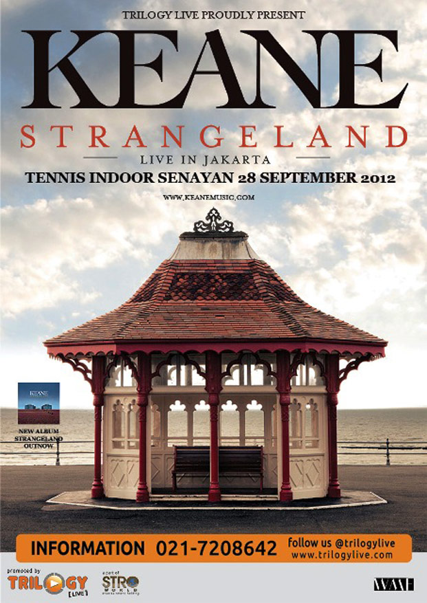 Keanemerupakan grup band Alternative Rock asal Battle, East Sussex, Inggris yang berdiri pada tahun 1997. Band yang digawangi oleh Tom Chaplin (lead vocals, organ, piano, acoustic guitar), Tim Rice-Oxley (piano, keyboards, synthesizers, electric guitar, bass guitar, backing vocals), Richard Hughes (drums, percussion, backing vocals), Jesse Quin (bass guitar, electric guitar, synthesizers, percussion, backing vocals) ini direncanakan akan menggelar konsernya di Jakarta pada 28 September 2012 mendatang di Tennis Indoor Senayan. Trilogy Live selaku promotor Keane ini sekaligus dalam rangka memperkenalkan rilis album keempat mereka yakni Strangeland, yang baru dirilis 4 Mei 2012 lalu. Penjualan tiket 'Keane South East Asia Tour' baru akan dibuka mulai 3 Agustus mendatang. Harga yang ditawarkan promotor untuk pre-sale adalah Rp 850 ribu untuk kelas Festival dan Rp 700 ribu untuk kelas Tribune. Untuk harga normal, kelas penonton akan dibagi menjadi tiga, yakni kelas Festival dengan mulai harga Rp 950 ribu, kelas Tribune Rp 850 ribu, dan kelas VIP Rp 1.750.000. (Roy)