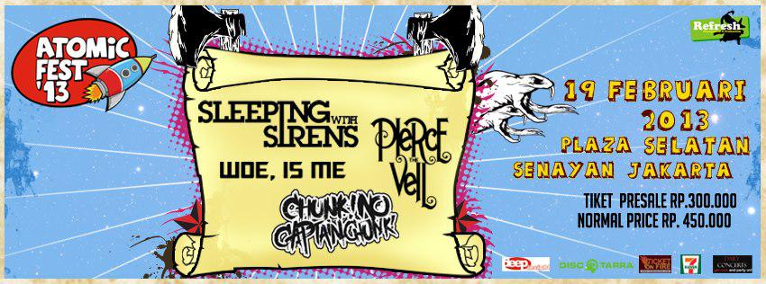 Festival musik berskala internasional kembali hadir di Jakarta, tak tanggung-tanggung 5 band asing akan hadir meramaikan. Lima band Post-Hardcore dan Rock yang sedang naik daun ini adalah Sleeping With Sirens, Pierce The Veil, Chunk No Captain Chunk, Woe is Me dan Memphis May Fire yang akan tampil pada 19 Februari 2013 mendatang di Plaza Selatan Senayan. Deep Insight dan Refresh Indonesia selaku promotor telah merilis harga tiket yang dibanderol untuk pre-sale 300 ribu dan normal price 450 ribu rupiah. (Roy,gedoor.com)