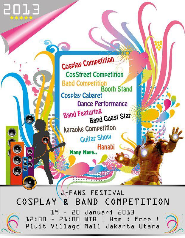 J-Fans Festival“ Cosplay And Band Competition” ini akan diadakan pada tanggal 19 dan 20 Januari 2013 di Pluit Village Mall, Jakarta Utara. Event ini berlangsung dari jam 12.00-21.00 Wib. Dan ada satu hal yang pastinya akan menarik banyak minat pengunjung adalah semua pengunjung yang datang adalah tidak dikenakan biaya masuk alias gratis.
