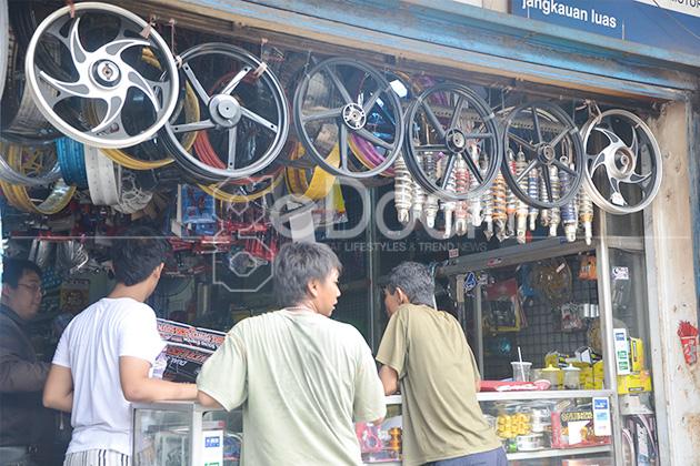 Hampir semua merek aksesoris dijual di sini, dan harganya pun bisa murah apabila Anda membeli dalam jumlah yang banyak atau borongan. Untuk kualitas dari aksesoris yang dijual juga beragam, dari yang original, KW 1, KW 2 juga ada di sini. Tapi sebaiknya Anda membeli dengan kualitas original, selain barangnya bagus motor tunggangan Anda pun akan terlihat lebih keren. Jika Anda ingin mengganti ban motor, tempat ini juga menyediakan jasa langsung pasang ban yang dibeli. (Angga W. Wardani/geDoor.com)